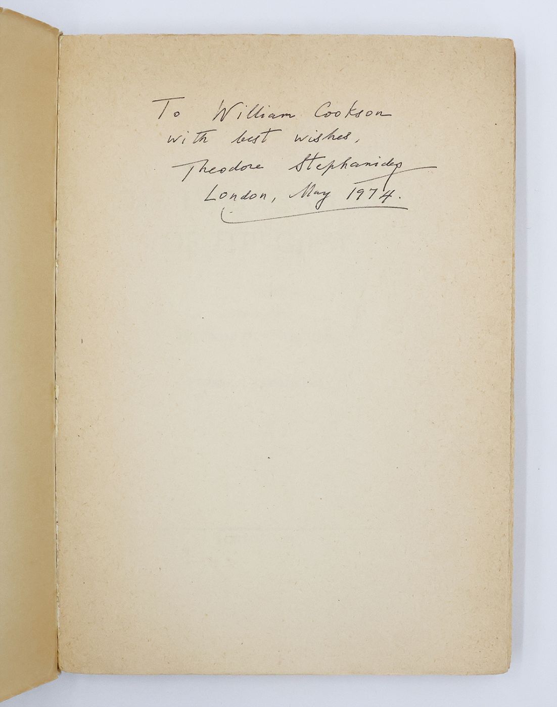 Signed and inscribed by Theodore Stephanides in black ink to the front free endpaper "To William Cookson / with best wishes, / Theodore Stephanides / London, May 1974". The first edition of Stephanides and Katsimbalis' translation of Palamas' poetical work, first published in Greek in 1907. Theodore Stephanides (1896-1983) was a Greek-British doctor and polymath, known as a naturalist, biologist, astronomer, poet, writer and translator, although is perhaps best remembered today as the friend and mentor of Gerald Durrell. Stephanides was notably depicted by Durrell in his most famous work, My Family and Other Animals, as well as in Prospero's Cell by Lawrence Durrell, The Colossus of Maroussias by Henry Miller, and numerous film and television productions. His translations of the work of Palamas were chief amongst his efforts to promote Greek poetry.