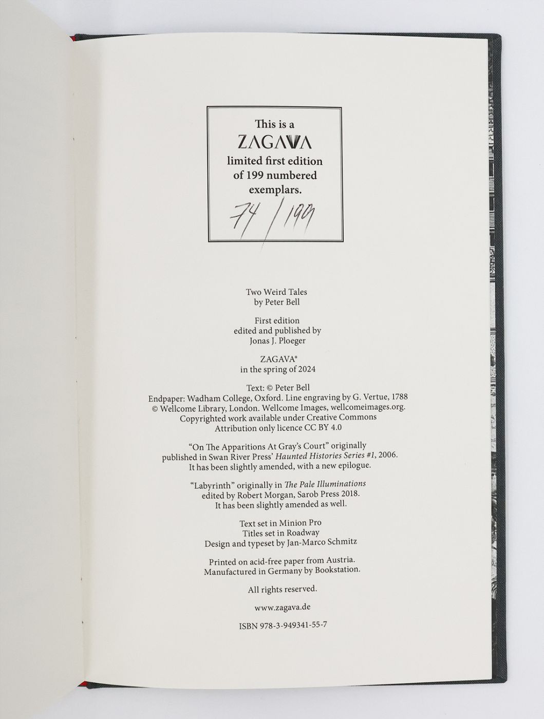 Issued in an edition of 199 copies, from which this example is numbered 74. 'On the Apparations at Gray's Court' was originally published in 'Haunted Histories' (Series #1 2006) by Swan River Press. 'Labyrinth' was first published in 'The Pale Illuminations' by Sarob Press in 2018. 'In these weird yarns of Academe, the past throws a long shadow and ancient myths survive. Whether labyrinthine landscape or eerie corridors, the locations themselves are players in these uncanny narratives, where the threshold between reality and unreality remains uncertain' (publisher's blurb)