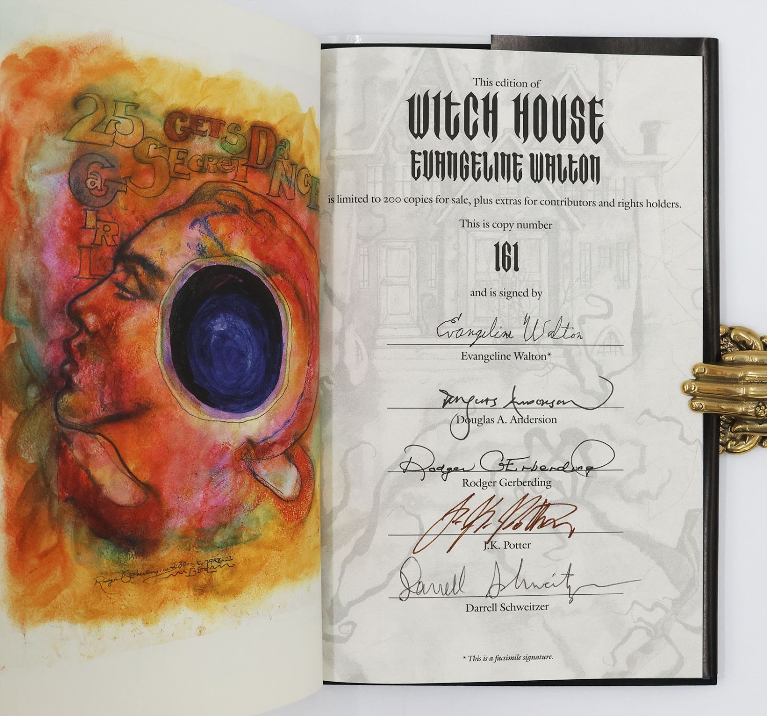 Issued in an edition of 200 copies, from which this example is numbered 161, and signed on the colophon by the illustrator Rodger Gerberding, cover artist J. K. Potter, the author of the introduction Douglas A. Anderson, and Darrell Schweitzer, whose interview with author Evangeline Walton is included to the rear of this collection. A facsimile of Walton's signature in black is also present. This expanded edition of Evangeline Walton's 1945 fantasy novel, includes a 20,000 word prologue by Walton, first published here in full, and two chapters of an unfinished novel about the Salem witchcraft trials.