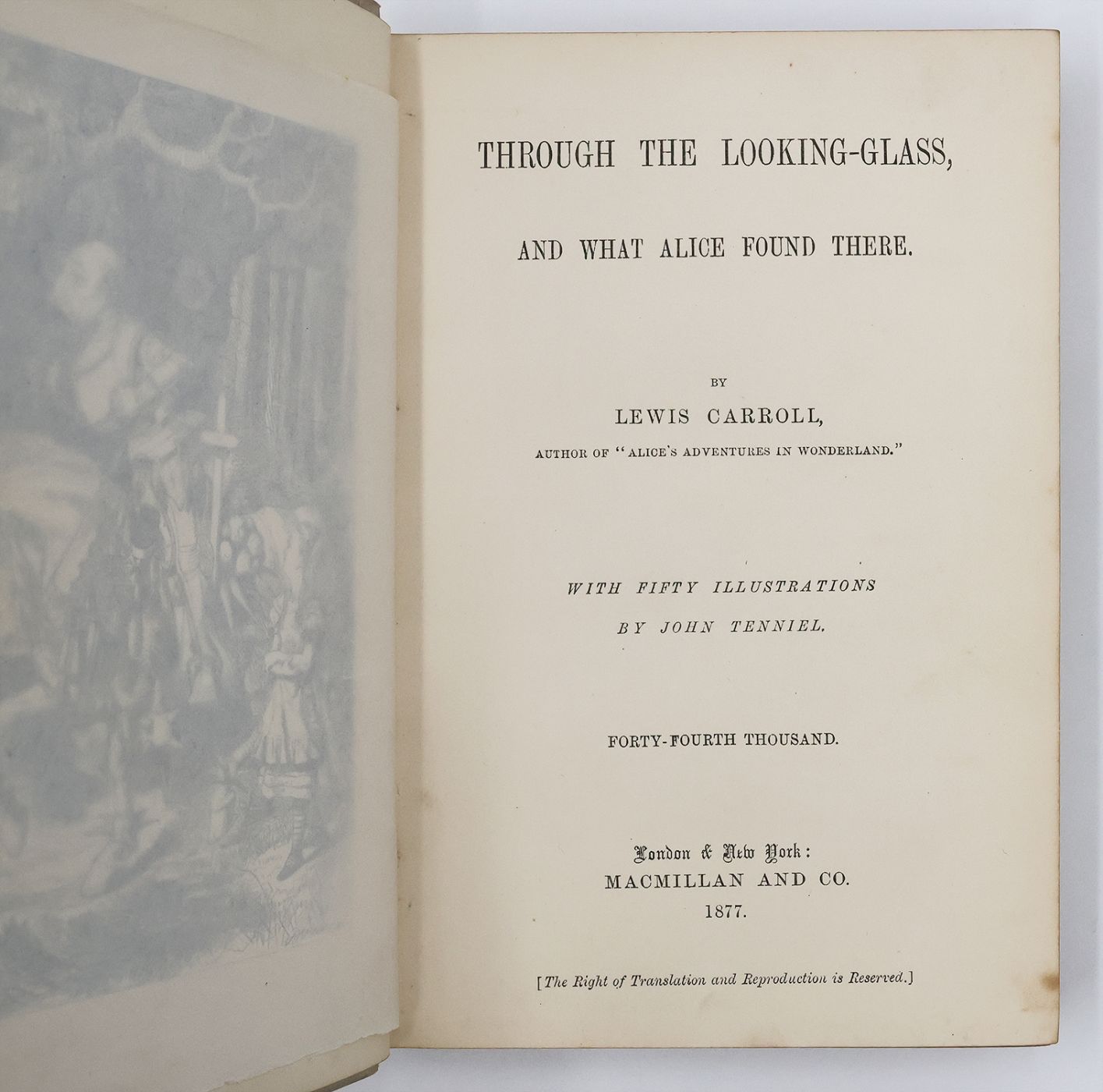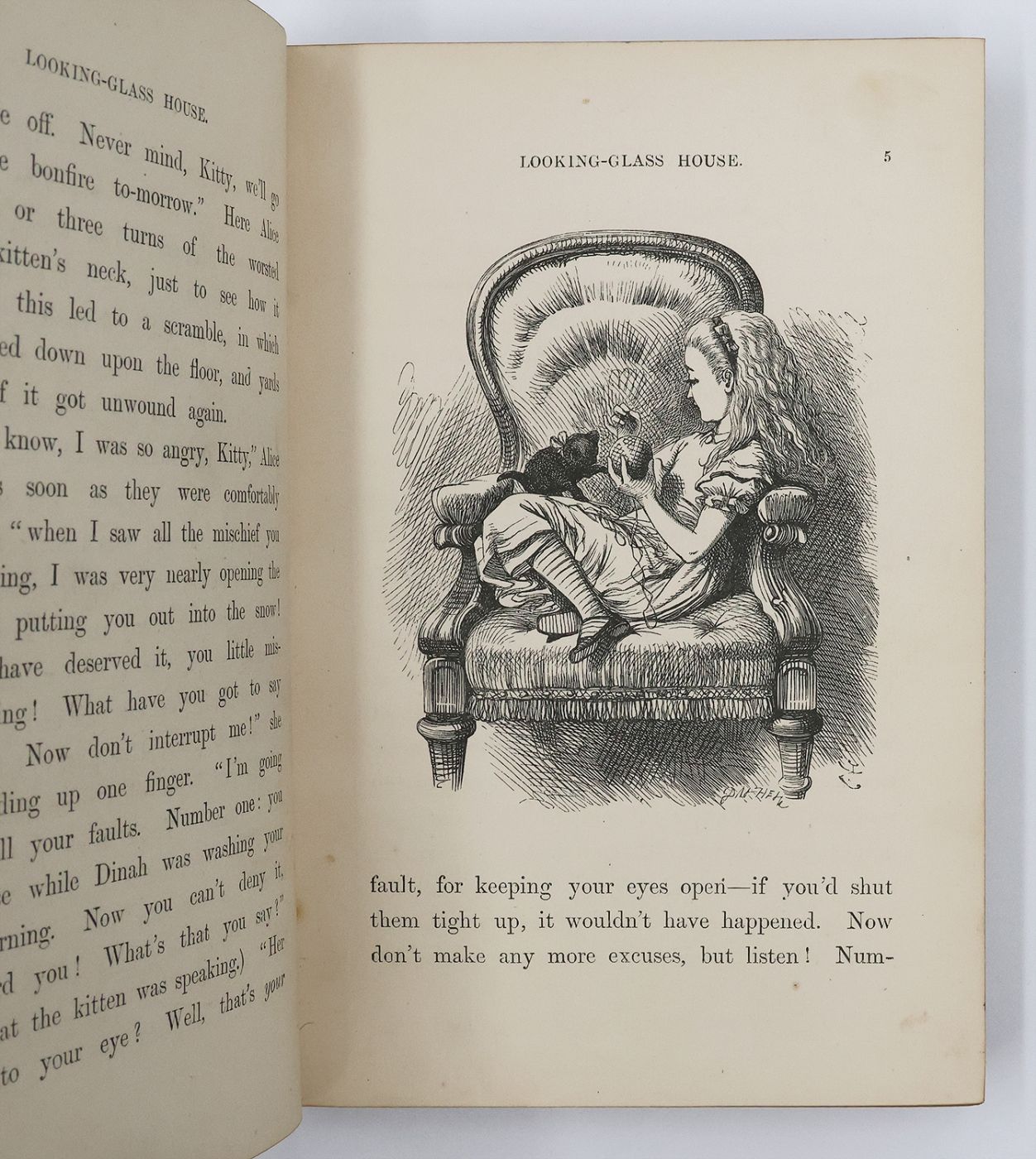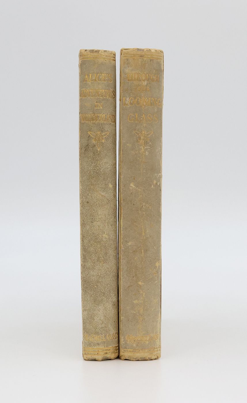 Two volumes. Author's presentation bindings of white textured paper-covered boards, imitating vellum, with gilt titles to the spines, gilt triple-ruled borders and gilt illustration motifs to the upper and lower boards. Inscribed presentation copies. Signed by the author. All edges gilt. 'Alice's Adventures in Wonderland', fifty-eighth thousand, with 42 black and white illustrations; 'Through the Looking Glass', forty-fourth thousand, with 50 illustrations by John Tenniel. Tissue guard to the frontispiece of 'Looking Glass'. Very good copies, the bindings firm, both with the spines slightly rolled. The lightly marked paper-covered boards are dusty and darkened, more so to the spines, 'Wonderland' with a clean square to the top corner of the upper board and the bottom corner of the lower board (from brass corner guards, since removed). There is some light bumping and wear to the corners and spine tips of both volumes, and 'Looking Glass' has minor splitting at the bottom of the spine where it meets the front board, although in both cases the binding remains firm. 'Wonderland' bears the recipient's ownership name to the top right corner of the half title, above the author's presentation inscription and has some creasing at the upper corner of the front endpaper. Both volumes are spotted to the prelims, with occasional finger marks and light spotting throughout. 'Looking Glass' is cracked (but holding firm) at the gutter of the half-title and has an autograph letter from the author, loosely laid in. An exceptional inscribed set of Lewis Carroll's Alice books, in the notably rare presentation bindings, and with a wonderful single family owned provenance.
