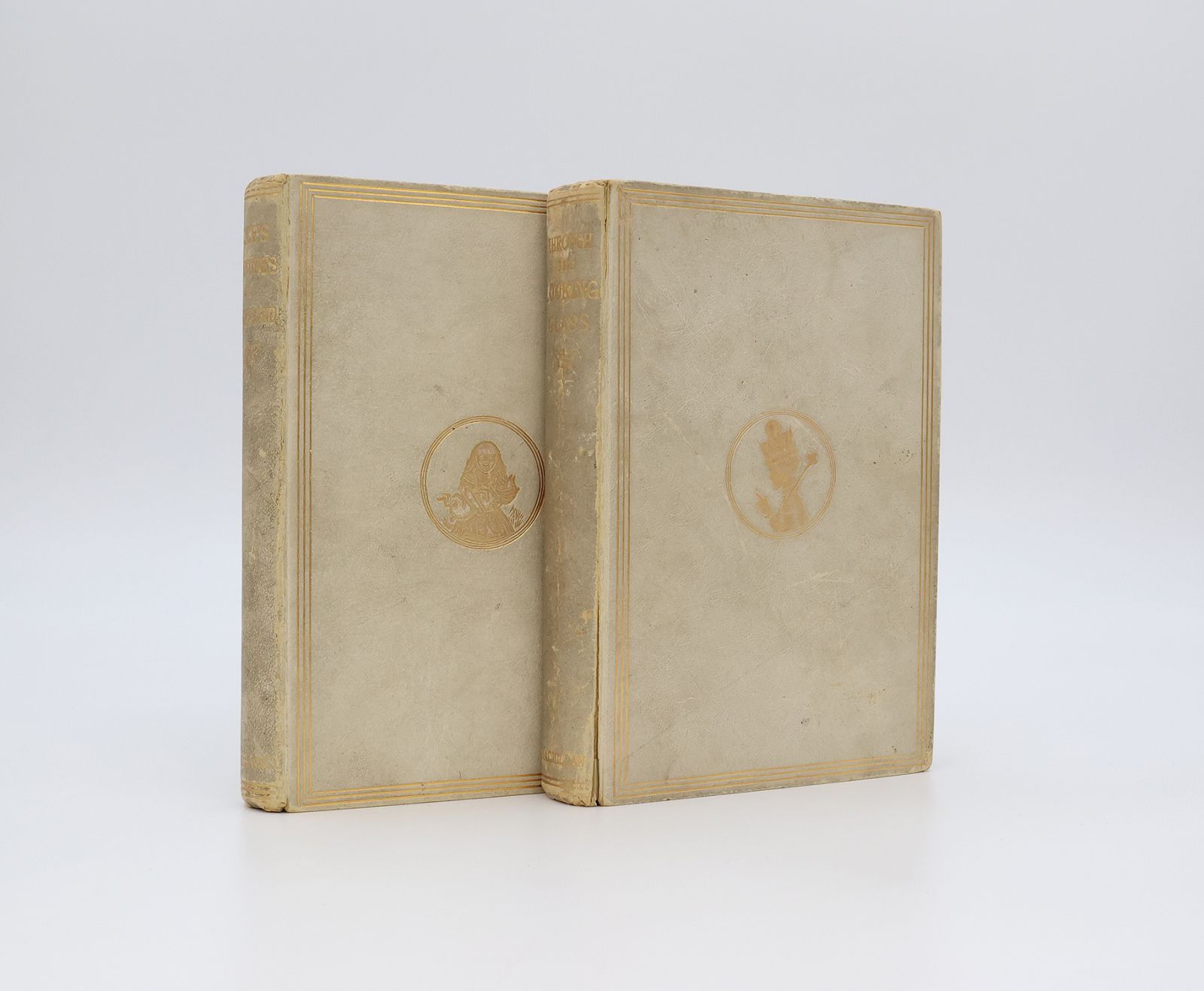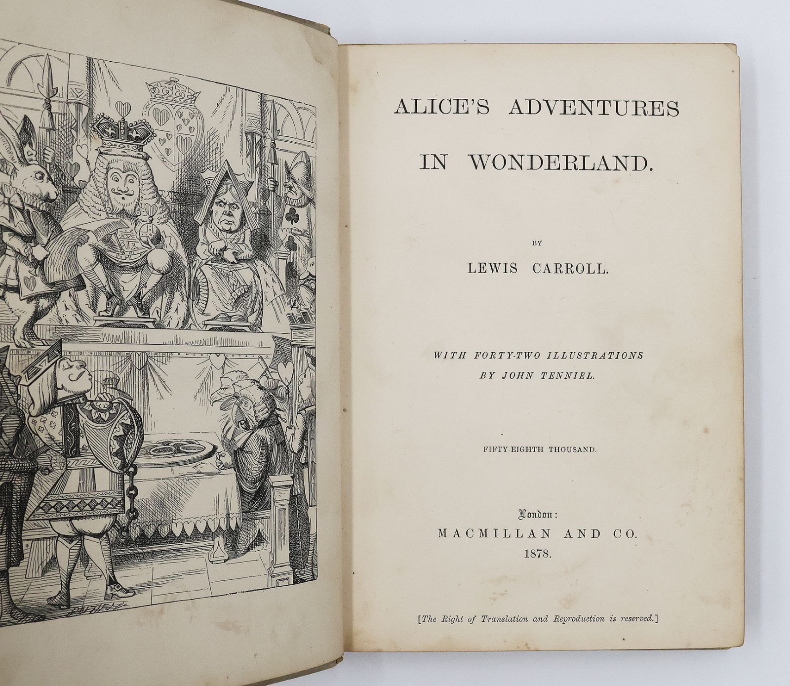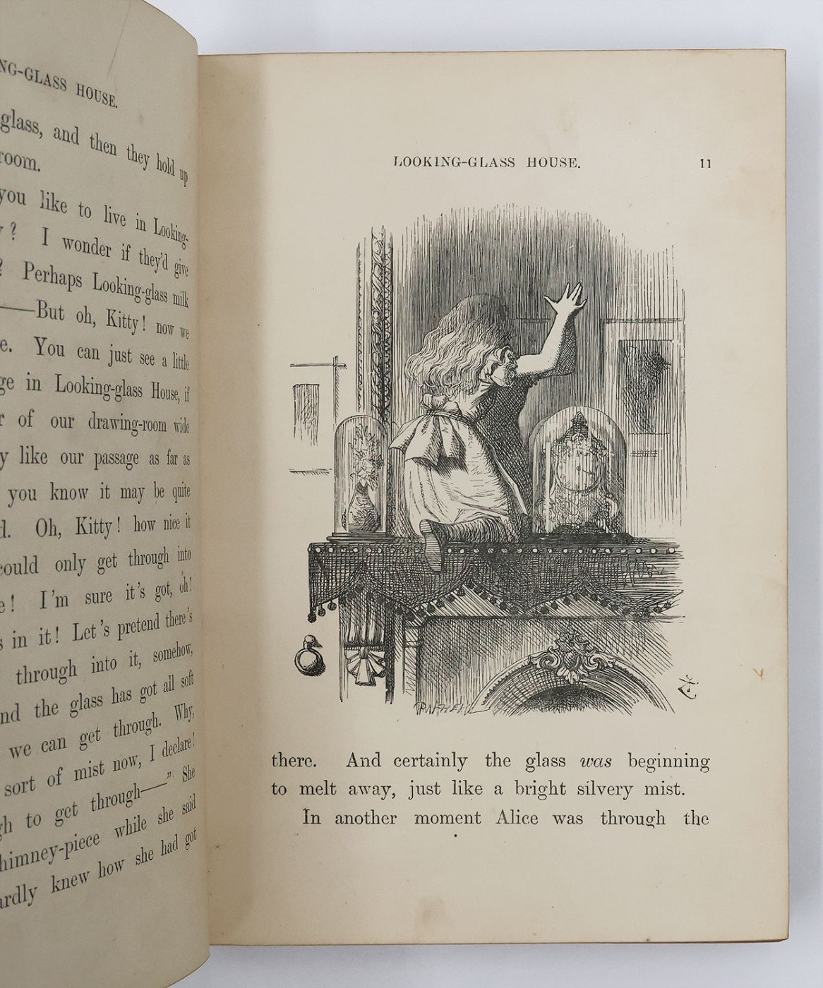 Two volumes. Author's presentation bindings of white textured paper-covered boards, imitating vellum, with gilt titles to the spines, gilt triple-ruled borders and gilt illustration motifs to the upper and lower boards. Inscribed presentation copies. Signed by the author. All edges gilt. 'Alice's Adventures in Wonderland', fifty-eighth thousand, with 42 black and white illustrations; 'Through the Looking Glass', forty-fourth thousand, with 50 illustrations by John Tenniel. Tissue guard to the frontispiece of 'Looking Glass'. Very good copies, the bindings firm, both with the spines slightly rolled. The lightly marked paper-covered boards are dusty and darkened, more so to the spines, 'Wonderland' with a clean square to the top corner of the upper board and the bottom corner of the lower board (from brass corner guards, since removed). There is some light bumping and wear to the corners and spine tips of both volumes, and 'Looking Glass' has minor splitting at the bottom of the spine where it meets the front board, although in both cases the binding remains firm. 'Wonderland' bears the recipient's ownership name to the top right corner of the half title, above the author's presentation inscription and has some creasing at the upper corner of the front endpaper. Both volumes are spotted to the prelims, with occasional finger marks and light spotting throughout. 'Looking Glass' is cracked (but holding firm) at the gutter of the half-title and has an autograph letter from the author, loosely laid in. An exceptional inscribed set of Lewis Carroll's Alice books, in the notably rare presentation bindings, and with a wonderful single family owned provenance.
