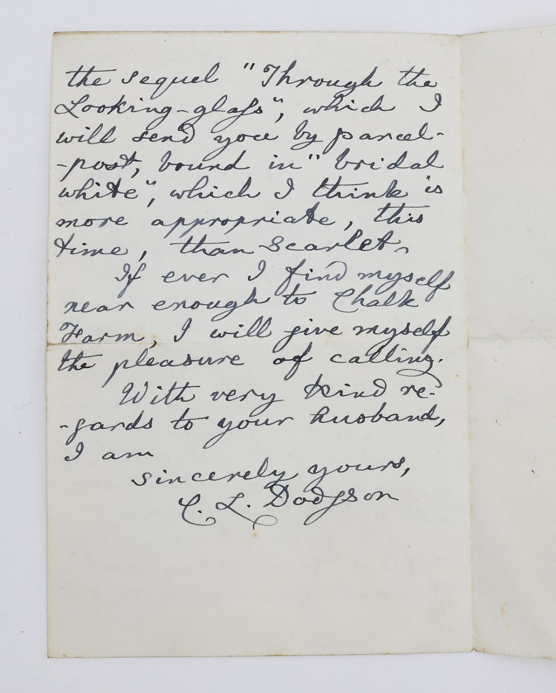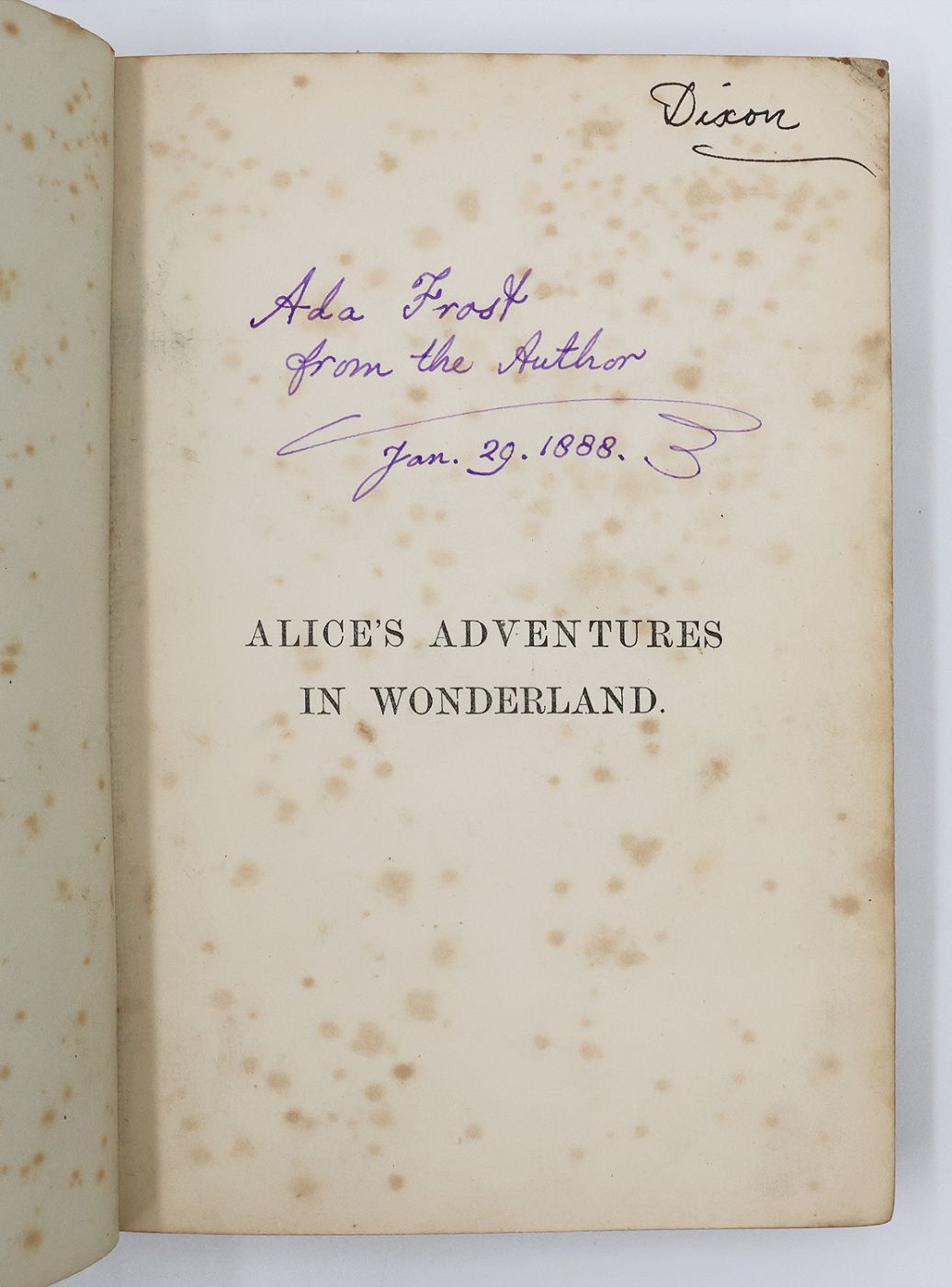'Alice's Adventures in Wonderland' is inscribed in purple ink on the half-title "Ada Frost / from the author / Jan. 29. 1888."; 'Through the Looking Glass' is inscribed in black ink on the half-title "Mrs Dixon, / from the author. / July 18, / 1892". The recipient Ada Dixon, (née Frost, 1874-1964), was a professional child model who sat for sketches made by Dodgson in Mrs Shute's studio in 1888 (Letters 2: 692-93), where presumably this copy of 'Alice's Adventures in Wonderland' was presented. 'Through the Looking Glass', inscribed some four years later was presented in celebration of Ada Frost's, (now Dixon) marriage, the accompanying letter, dated the same day as the author's inscription in the book, reads "Dear Mrs Dixon, I am so very much obliged to you for writing to one, and was very glad indeed to get your letter and to know that you still remember me as a friend, and that you have turned over another leaf in the book of the story of your life, and have found such pleasant reading on the other side! I wish, to your husband and you, all possible happiness. As you already have "Alice in Wonderland" I want you now to accept the sequel "Through the Looking Glass", which I will send you by parcel-post, bound in "bridal white", which I think is more appropriate, this time, than scarlet. If ever I find myself near enough to Chalk Farm, I will give myself the pleasure of calling. With very kind regards to you husband, I am sincerely yours, C. L. Dodgson". Dodgson had white, gilt-stamped copied bound exclusively for his use as presentation copies for his close friends and cherished acquaintances, typically keeping a few on hand to give as gifts as and when he needed them, naturally making this variant notably scarce. Whilst Dodgson is known primarily for his writing, he was also a keen amateur photographer and artist. He created thousands of photographs in the Victorian symbolist tradition formed by the likes of Julia Margaret Cameron and Oscar Gustave Rejlander, and illustrated his own written drafts, including a precursor to what would become 'Alice's Adventures in Wonderland', a hand written manuscript titled 'Alice's Adventures Under Ground'. Ada Dixon was among many models who posed for Dodgson's photographs and sketches, and it was not uncommon for him to form friendships with them, exchanging letters and even attending their weddings. The most famous of his models is undoubtedly Alice's namesake herself, Alice Liddell, a daughter of Henry Liddell, who was the Dean of Christ Church College, Oxford, where Dodgson was a lecturer of mathematics. As well as employing them as photographic subjects, Dodgson would take the Liddell children out on rowing trips, and it was on one such trip that he first told a tale of the fantasy world through the rabbit hole, which Alice Liddell enjoyed so much that she begged him to write it down. Provenance: presented by the author to Ada Dixon (nee Frost) in 1888 and 1892, thence by family descent.