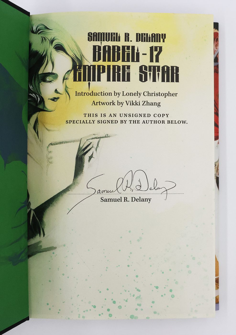 Loosely laid in is a publisher's sheet repeating part of the title page illustration stating "This is an unsigned copy, specially signed by the author" underneath which Samuel R. Delany has signed in black ink.