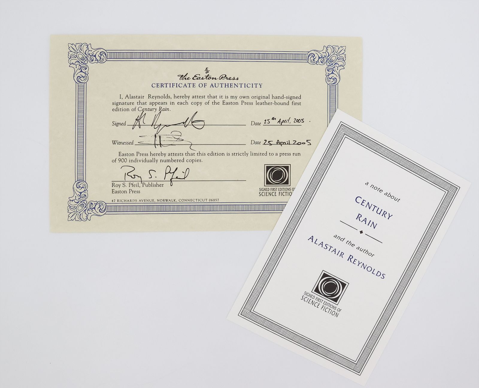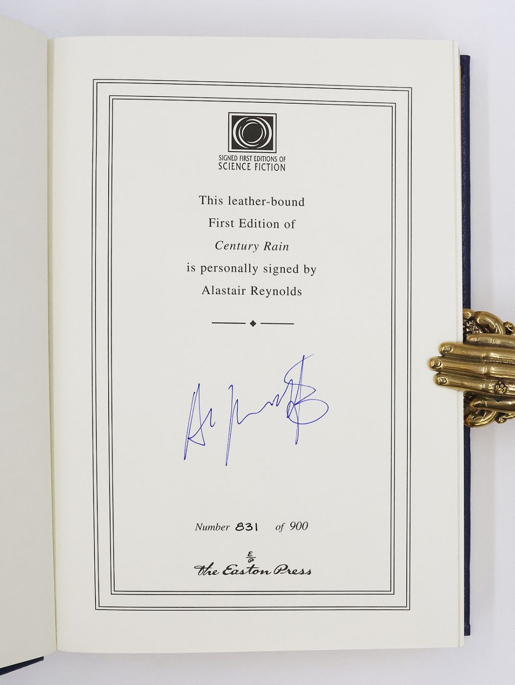 Issued in a limited edition of 900 copies, from which this example is numbered 831 and signed by Alastair Reynolds in blue ink on the limitation page. An alternative history mystery novel, bridging space and time. The author has a PhD in astrophysics and spent many years working for the European Space Research and Technology Centre before becoming a full-time writer; his scientific knowledge underpins the Revelation Space universe, lending it particular detail and plausibility.
