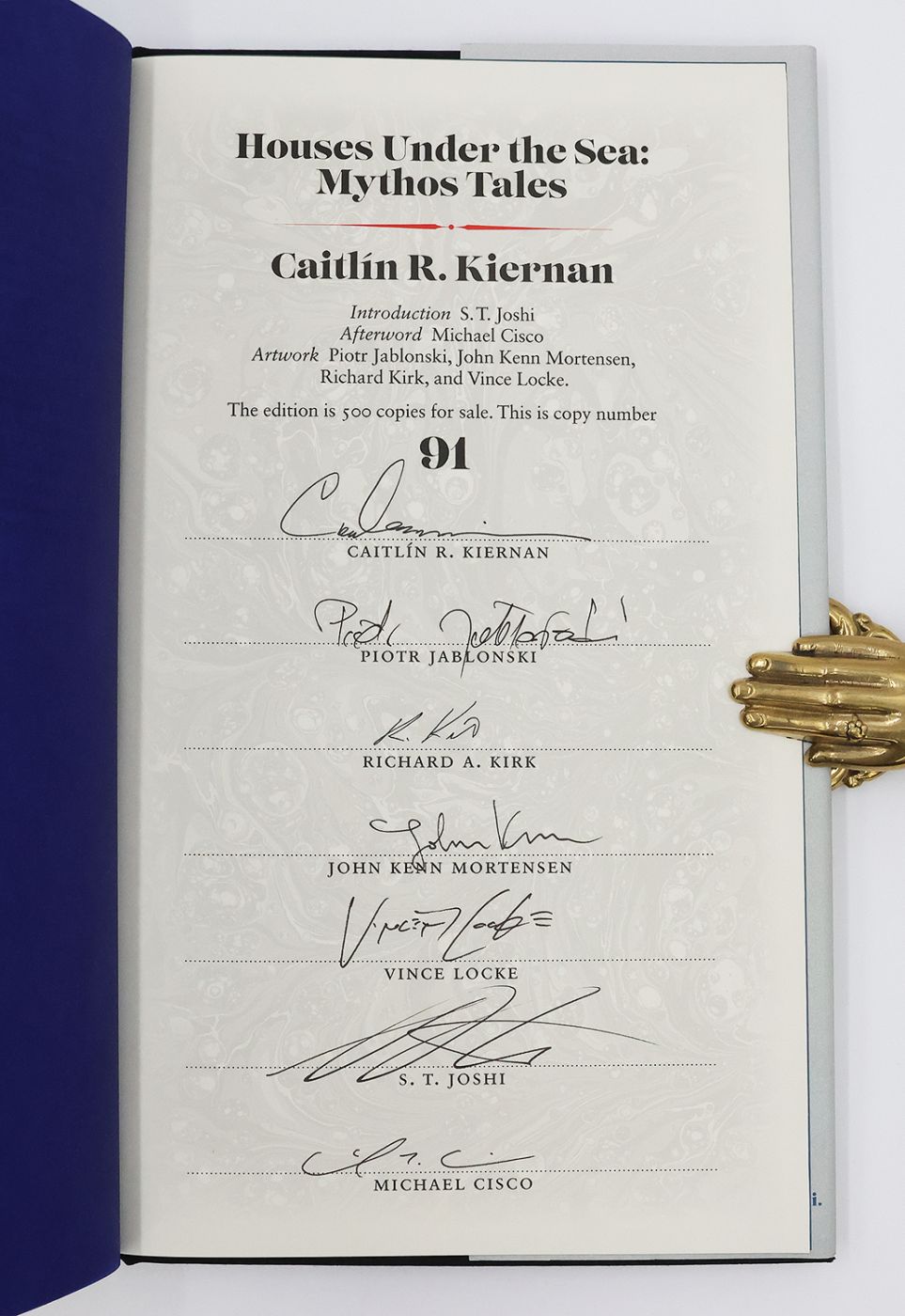 Issued in a limited edition of 500 copies of which this example is number 91. Signed by the author Caitlín R. Kiernan, the illustrators Piotr Jablonski, Richard Kirk, Vince Locke, John Kenn Mortensen and the introduction and afterword contributors S. T. Joshi and Michael Cisco in black ink on the limitation page. A collection of 30 'Lovecraftian' inspired tales written by Caitlín R. Kiernan between 2000 - 2015.