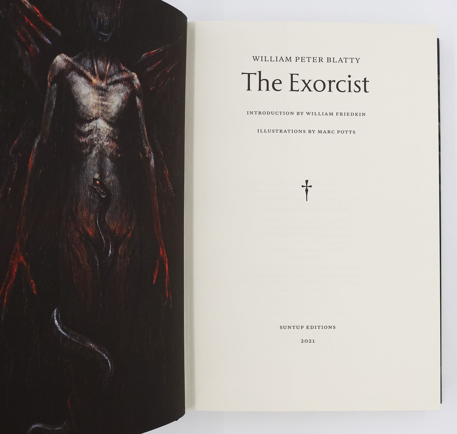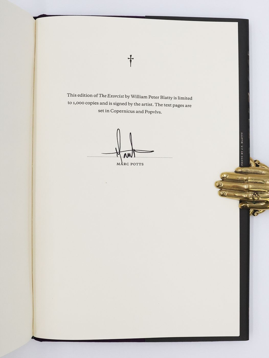 The 'Artist' edition, issued in a limited edition of 1000 copies signed by the artist Marc Potts in black ink on the colophon. William Blatty's fifth novel, most famous for its 1973 film adaptation, directed by William Friedkin (who contributes the introduction here) and starring Ellen Burstyn, Max von Sydow, Jason Miller, and Linda Blair. In addition to providing the screenplay, Blatty was also a producer on the film.