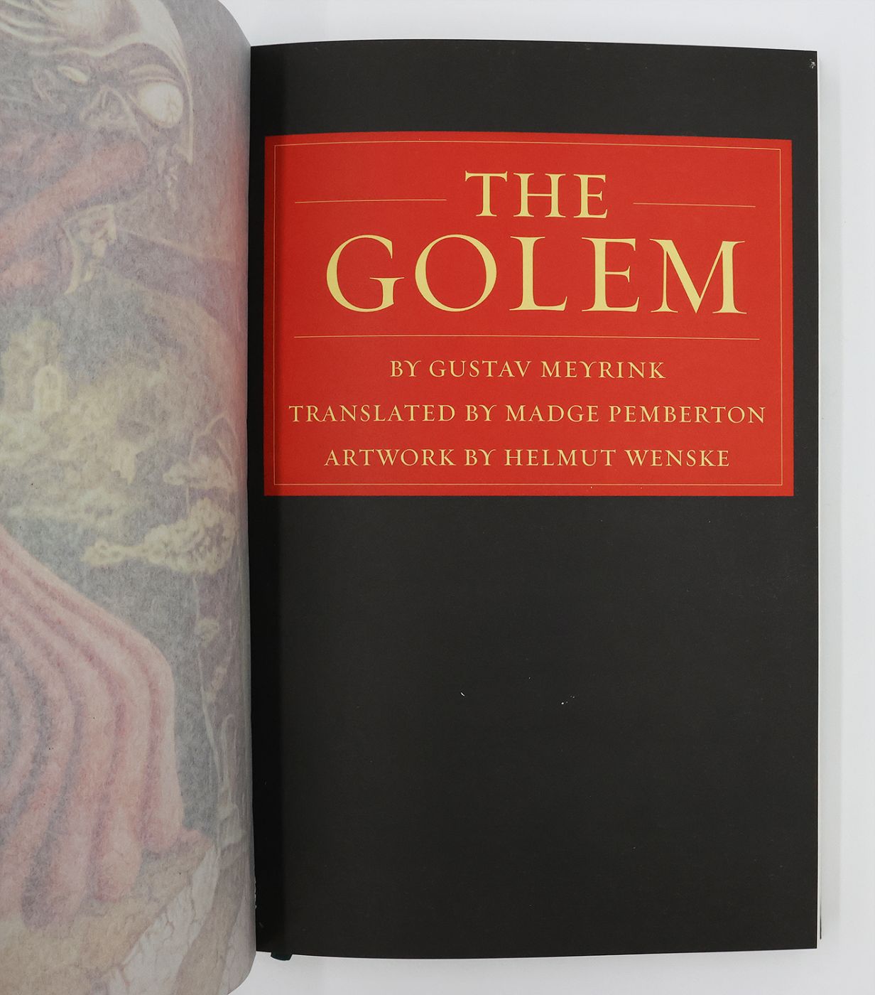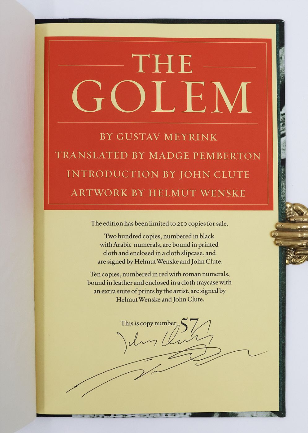 Issued in a limited edition of 210 copies, this example is numbered 57 and is signed by John Clute and Helmut Wenske in black ink on the limitation page. A beautifully produced edition of Gustav Meyrink's classic, hallucinatory gothic novel based on an old Prague myth about a man formed from the mud of the Vltava River. Originally serialised in Die Weißen Blätter in 1913 and 1914, it was first published in book form by Kurt Wolff in Germany in 1915. An immediate success, 'The Golem' sold 200,000 copies in the first year of publication. German psychedelic artist Helmut Wenske's series of 12 paintings inspired by Meyrink's novel, first completed in the 1970s, are published in combination with the source material here for the first time. Also included are images from the 1920 silent expressionist film 'Der Golem' directed by Paul Wegener, which was based on the novel.