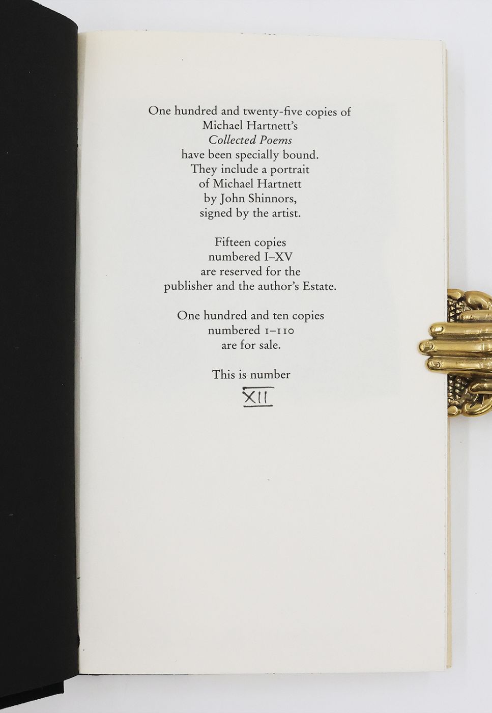 Issued in an edition of 110 copies, form which this example is numbered XII of the first 15 copies that are reserved for the publisher and poet's estate. Signed by John Shinnor in black ink underneath his portrait of Michael Hartnett. The first edition was published in simultaneous paperback and hardback editions, on 18 September 2001. A loving tribute to Hartnett's forty year-long poetry career, this collection includes 'Poems 1958-1970', 'Secular Prayers'(1967), 'Anatomy of a Cliché' (1968), 'Thirteen Sonnets' (1968), 'Notes on My Contemporaries' (1969), 'Maiden Street' (1967), 'Prisoners' (1968), 'The Retreat of Ita Cagney' (1975), 'Inchicore Haiku' (1985), 'New Poems' (1990-1999), and a selection of poems taken from 'A Farewell to English' (1975), 'Poems to Younger Women' (1988), 'The Killing of Dreams' (1992), and 'Selected and New Poems' (1994). The poems are printed in this volume without any indication of publishing history or provenance (the contents, however, are given in roughly chronological order). A former poetry editor of The Irish Times, Hartnett was a member of Aosdána, the Affiliation of Creative Artists in Ireland, and a recipient of numerous literary and poetry awards during his lifetime, including the Irish Poetry Prize (1980), a Poetry Ireland Choice (1987), and awards from the Irish American Cultural Institute (1986, 1988) and the American Ireland Literary Fund Award (1975, 1980, and 1990). Michael Hartnett sadly passed away on 13th October 1999, at the age of 58. The Éigse Michael Hartnett, a poetry festival established in 2000, is held annually in Newcastle West, County Limerick, in his honour (Poetry Foundation, 2025).