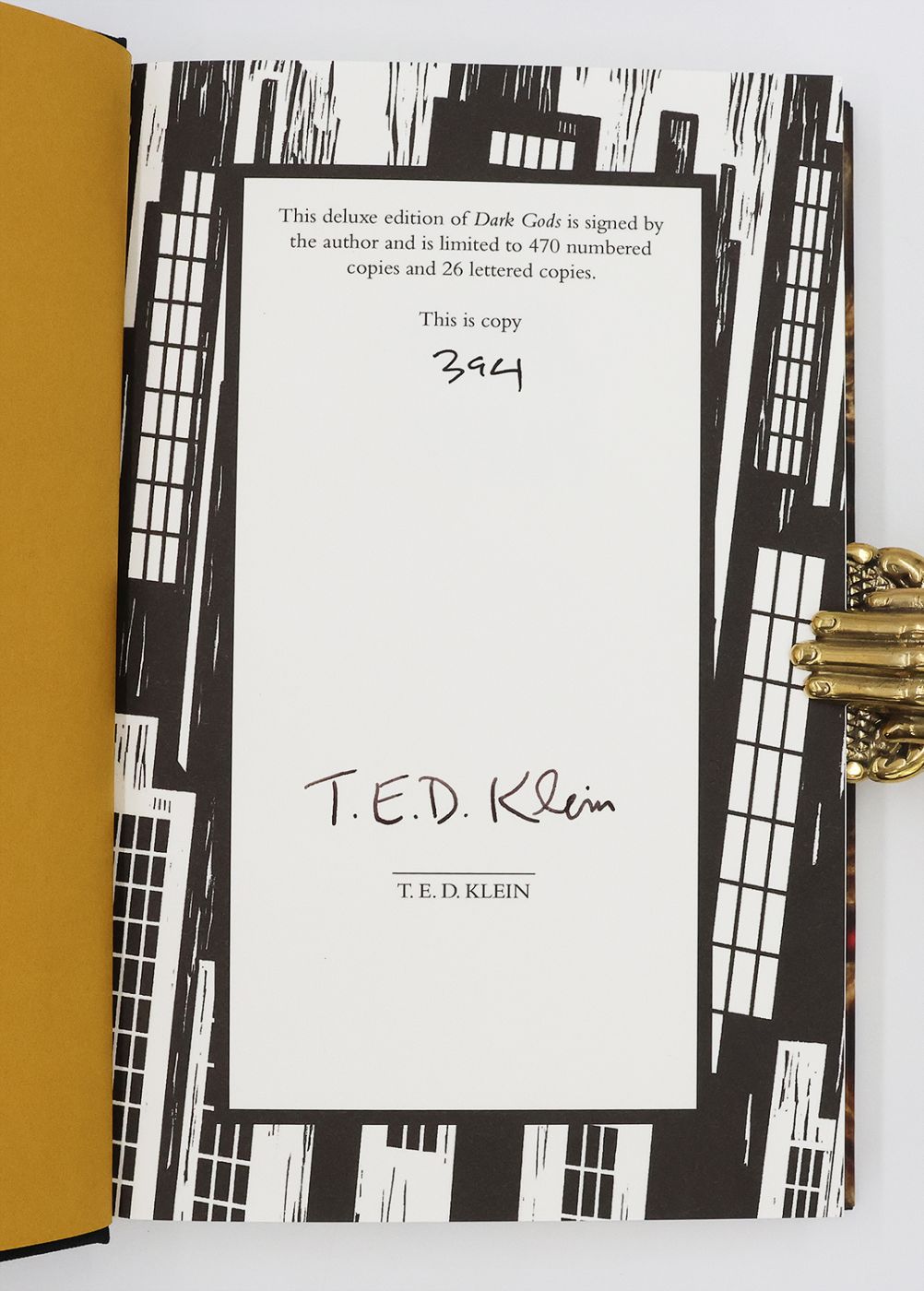 Issued in an edition of 470 copies, from which this example is numbered 394 and signed by the author T. E. D. Klein in black in on the limitation page. A collection of four short stories, three of which were originally published in anthologies, with 'Children of the Kingdom' in 'Dark Forces' (1980), 'Petey' in 'Shadows 2' (1979) and 'Black Man with a Horn' in 'New Tales of the Cthulhu Mythos' (1980). The first collected edition in book form, 'Dark Gods', was published in 1985 by Viking and included a fourth story, 'Nadelman's God'.