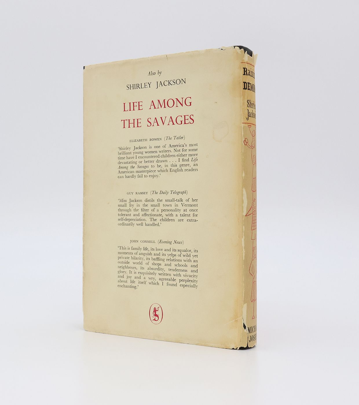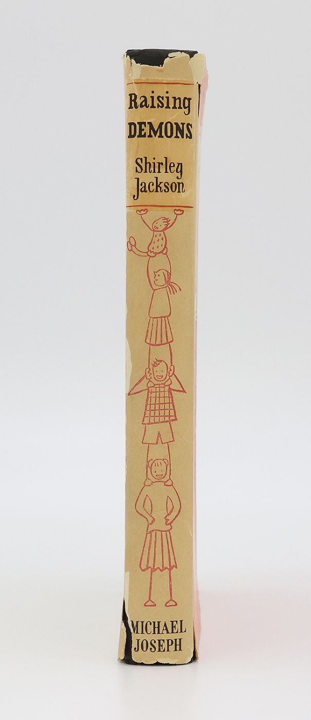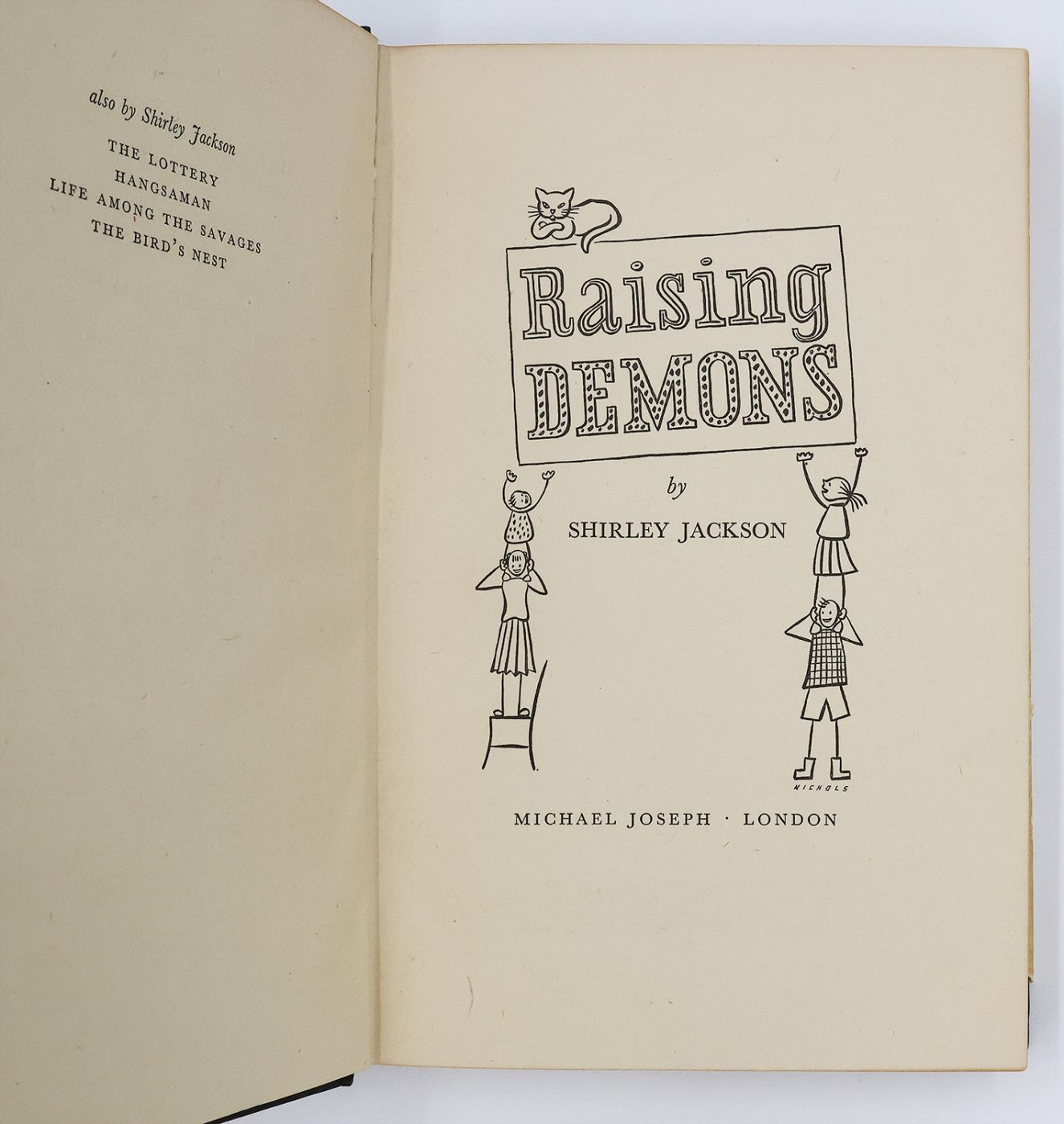 Inscribed by Shirley Jackson in black ink on the front free endpaper "For Eleanor and Franklin [Ford]. / with love. / Shirley. / 1957". A sequel to Jackson's 1953 title 'Life Among the Savages', a series of fictionalised short stories about Jackson's life as a mother and wife, originally published in magazines such as Good Housekeeping and Woman's Home Companion, edited together into one text. 'Raising Demons' follows the same format, starting soon after 'Savages' ends, and is full of wacky, comedic stories about Jackson's four characterful children, her academic husband and their eccentric life together. A distinct departure from her usual gothic literary fare (though maintaining her unmistakable wit and style), Jackson's humorous domestic memoirs were a resounding and welcome commercial success following the lukewarm reception to her second novel, the 1951 eerie coming-of-age story 'Hangsaman'. The proceeds of the memoirs granted Jackson a previously unknown level of financial security and allowed her to buy the house in which she would write her masterpieces 'The Haunting of Hill House' and 'We Have Always Lived in the Castle'. An excellent example of a scarce inscribed Jackson title.