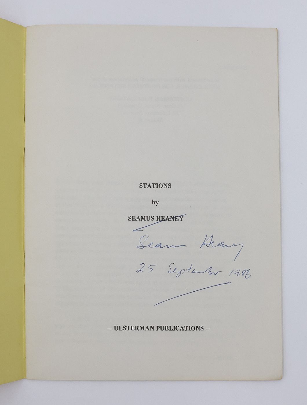 Signed and dated "25 September 1986" in blue ink by Seamus Heaney to the title page. Although unmarked as such, this copy is from the library of Frank Pike, drama editor at Faber and Faber and the poet's friend. The prose poems of 'Stations' were, the author writes in a brief preface (Glanmore, March, 1975), "begun in California in 1970/71 although the greater part of them came rapidly to a head in May and June last year. The delay was partly occasioned by the appearance of Geoffrey Hill's Mercian Hymns: what I had regarded as stolen marches in a form new to me had been headed off by a work of complete authority. But a second, less precisely definable block was in the air when I came back to Belfast: those first pieces had been attempts to touch what Wordsworth called "spots of time", moments at the very edge of consciousness which had lain for years in the unconscious as active lodes of nodes, yet on my return a month after the introduction of internment my introspection was not confident enough to pursue its direction. The sirens in the air, perhaps quite rightly, jammed those other tentative if insistent signals. So it was again at a remove, in the "hedge-school" of Glanmore, in Wicklow, that the sequence was returned to, and then the sectarian dimension of that pre-reflective experience presented itself as something asking to be uttered also. I think of the pieces now as points on a psychic turas, stations that I have often made unthinkingly in my head. I wrote each of them down with the excitement of coming for the first time to a place I had always known completely." (Brandes and Durkan A10)