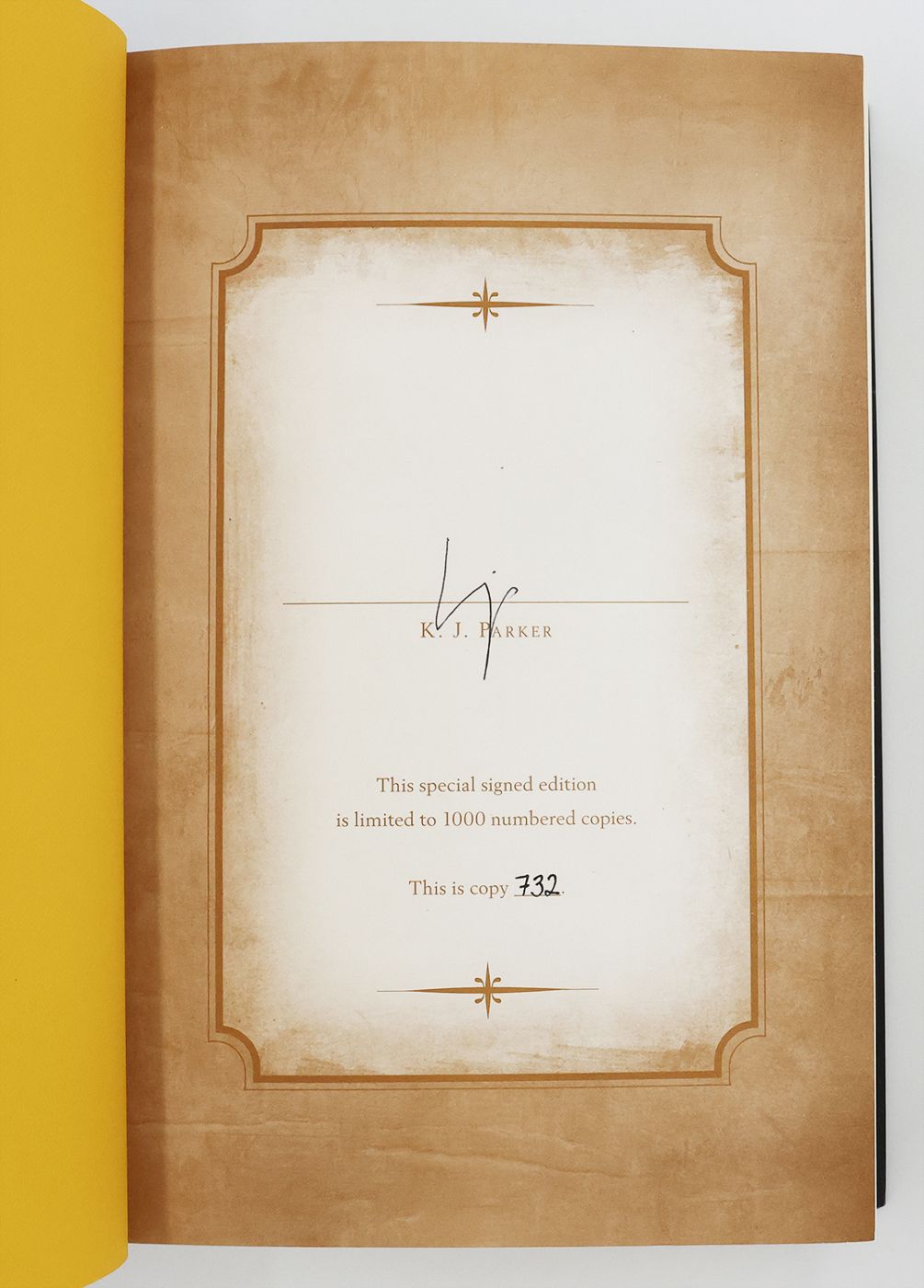 Issued in an edition of 1000 copies, from which this example is numbered 732, and signed by K. J. Parker in black ink on the limitation page. K. J. Parker's true identity, Tom Holt, was kept secret for 17 years, until April 2015. This collection of twelve novellas and novelettes comprises some of his most celebrated short works of fiction, including the Locus Award-nominated 'The Things We Do for Love'; 'I Met a Man Who Wasn't There'; 'Heaven Thunders the Truth'; and 'The Dragonslayer of Merebarton'.