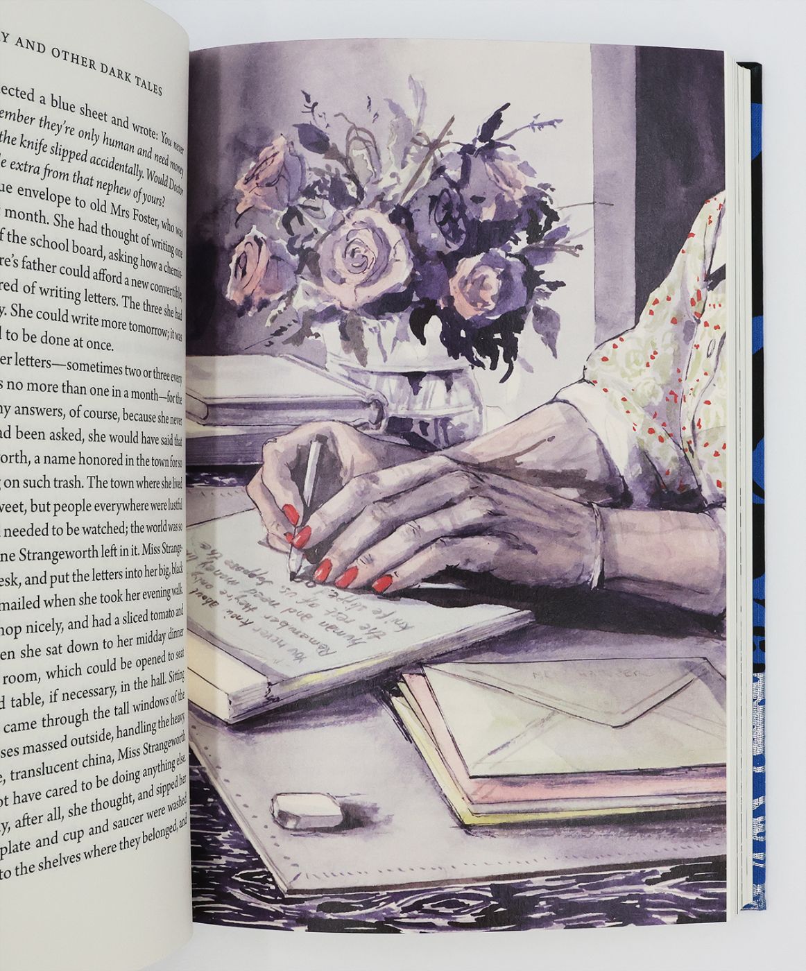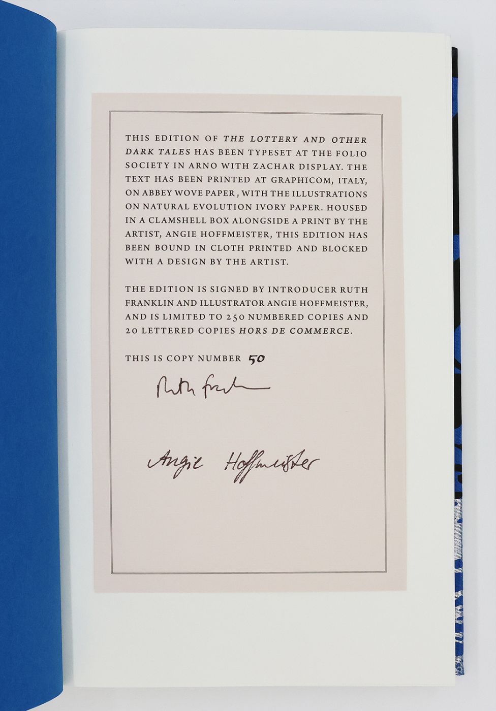 First edition with these illustrations, first printing. Signed by the author of the introduction, Ruth Franklin and the illustrator Angie Hoffmeister. Issued with an illustration print by Hoffmeister depicting Shirley Jackson that is not published in the book, housed in a blue card envelope. Original blue cloth with titles in black and silver to the spine and illustrations in black and silver to the upper and lower boards. Housed in an illustrated solander box with a magnetised central opening. Top edge silver. Endpapers illustrated in blue foil. Illustrated with seven colour plates by Hoffmeister, including two double-page spreads, as well as a number of black and white tailpieces. A fine copy, the binding square and tight, the contents clean throughout and without previous owners' stamps or inscriptions. The illustrated solander box, with a small bump to the top right corner of the lower board, is otherwise fine. The print is in fine condition.