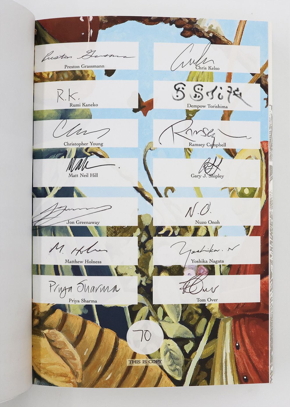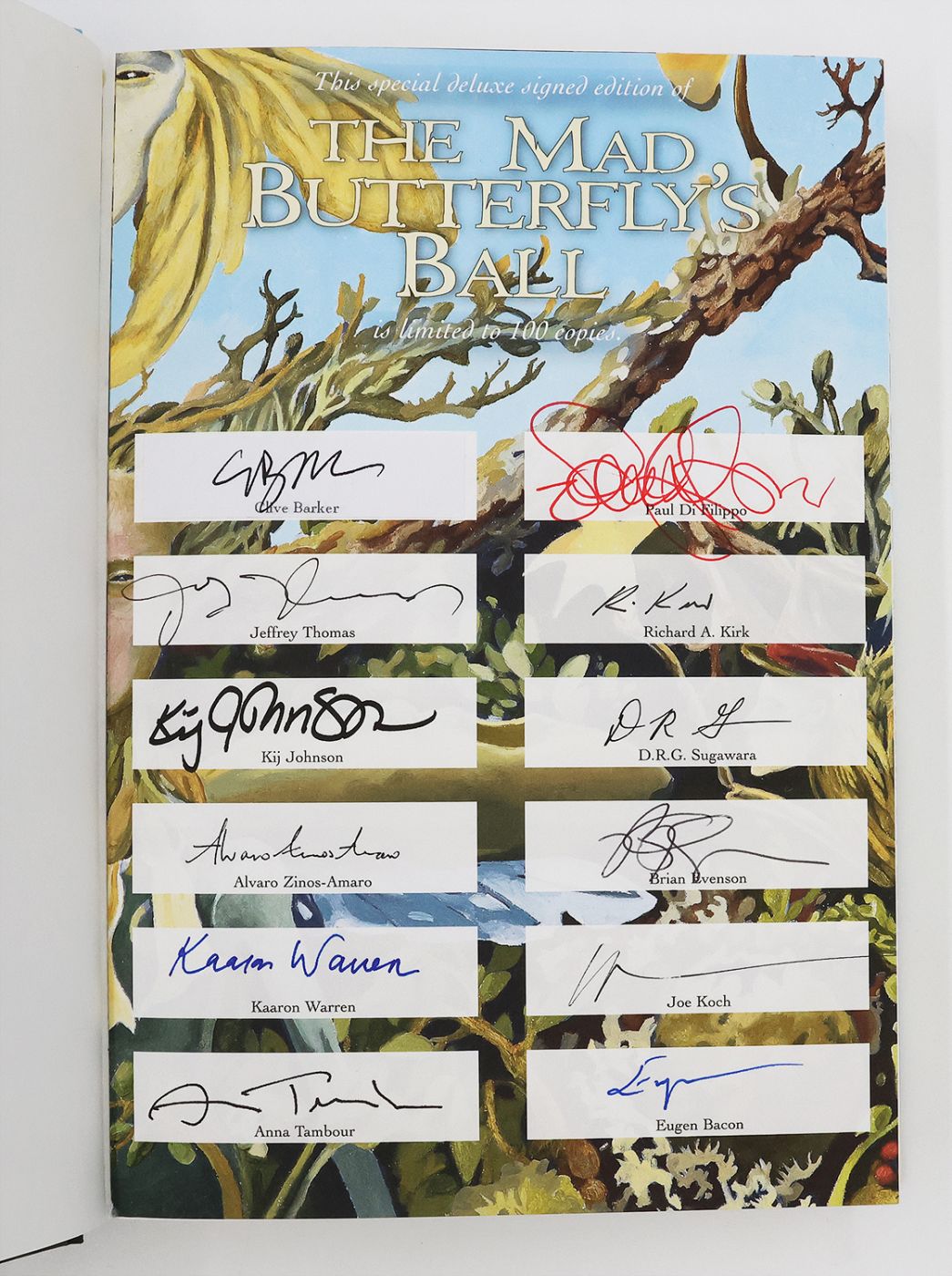 Issued in a limited edition of 100 copies, from which this example is numbered 70, and is signed by both editors, all three illustrators, and 21 contributing authors on the limitation page. Described by author and illustrator Richard A. Kirk in his 2024 blog post as 'a new insect themed anthology of weird fiction and essays', 'The Mad Butterfly's Ball' is divided into three parts, 'Head', 'Thorax' and 'Abdomen'. Authors featured in this anthology include: Clive Barker, Paul Di Filippo, Jeffrey Thomas, Kij Johnson, Richard A. Kirk, Priya Sharma, Tom Over, Lafciado Hearn, Eugen Bacon, Joe Koch, Anna Tambour, Nuzo Onoh, Matthew Holness, Arlton Eadie, Rumi Kaneko (translated by Preston Grassmann), Thomas M. Disch, D. R. G. Sugawara, Brian Evenson, Matt Neil Hill, Dempow Torishima, H. G. Wells, Preston Grassmann, E. F. Benson, Kaaron Waaren, Christopher Young, Algernon Blackwood, Ramsey Campbell, Alvaro Zinos-Amaro, Emily Dickinson, Henri Fabre, Preston Grassmann, Gary J. Shipley, Jon Greenaway, and Chris Kelso.