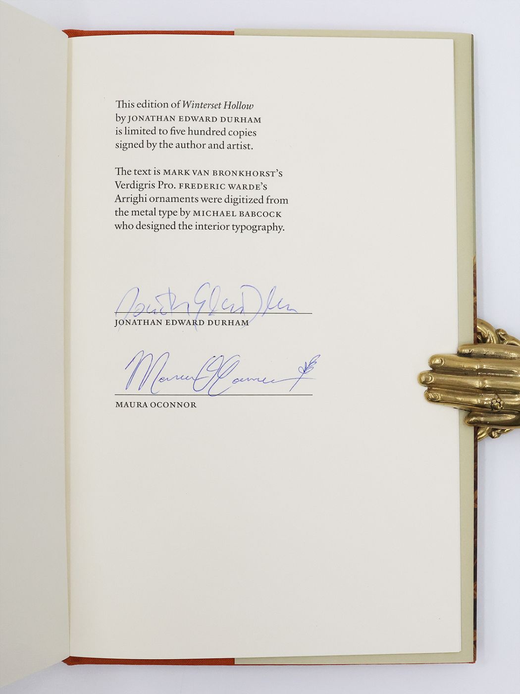 'Classic Edition' issued in an edition of 500 copies, signed by the author Jonathan Edward Durham and the illustrator Maura OConnor in blue ink on the colophon. The author's debut novel.