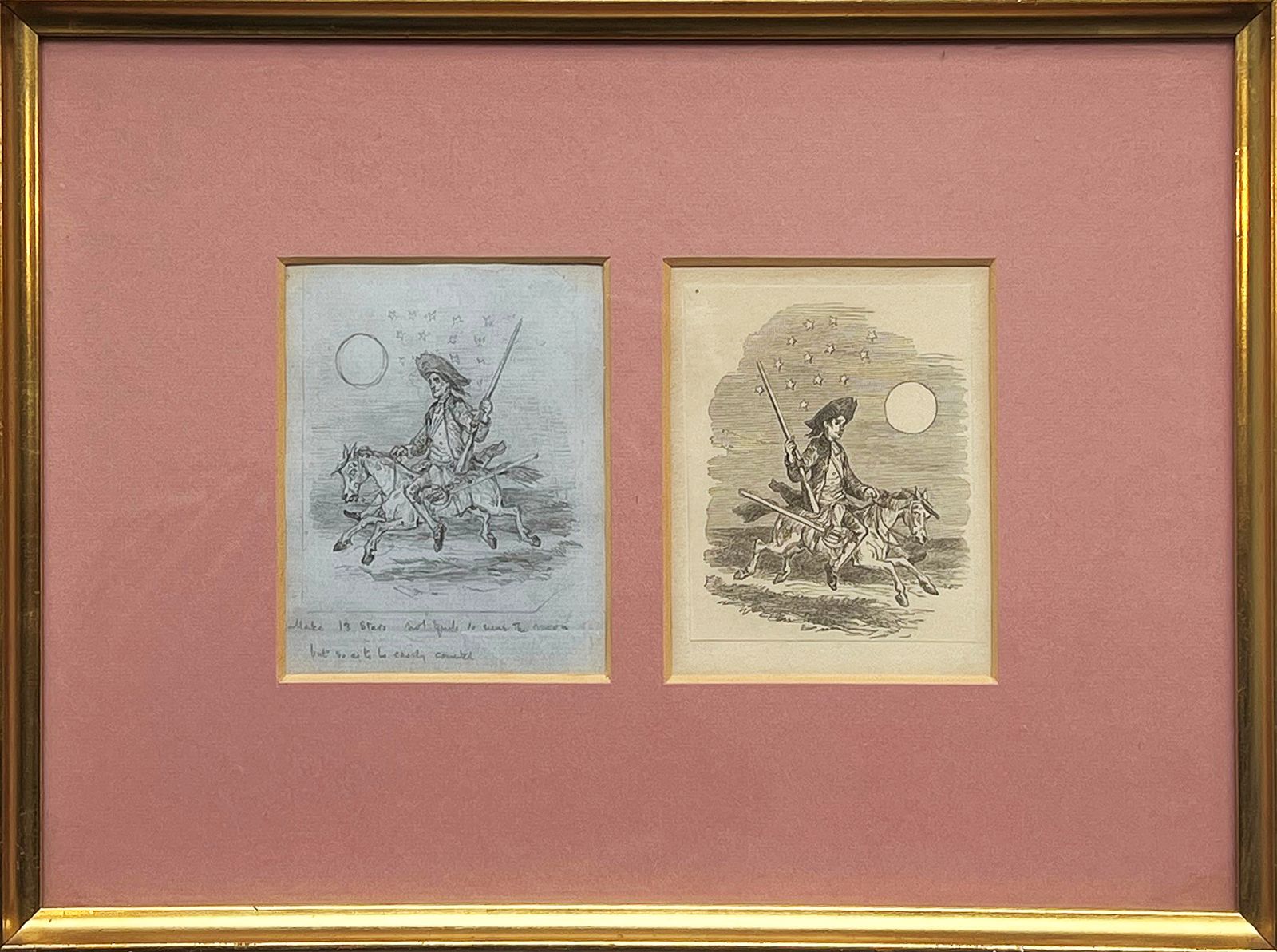 An original pencil drawing on blue paper by William Makepeace Thackeray for his novel 'The Virginians', accompanied by the engraving as it appeared in the first edition. The drawing shows Captain Hal on horseback wielding a musket beneath the moon and thirteen stars, representing the Thirteen Colonies. There are instructions for the engraver written in pencil (in the hand of the artist / author) below the the drawing, "Make 13 stars not quite so near the moon / but so as to be easily counted". The drawing and engraving are window mounted side by side and framed under glass. Each window measures 9 x 11.7 cm, while the frame measures 36 x 27. In near fine condition, the drawing and engraving clean with slight toning towards the edges. The frame's gilt is slightly rubbed in a few areas, remaining otherwise bright and sound. To the rear there is a circa 1940s-1950s Rowley Gallery Frame Maker's label and a previous owner's provenance label stating that the piece was bought in Cecil Court in 1959. An excellent original artwork by a quintessential Victorian author.
